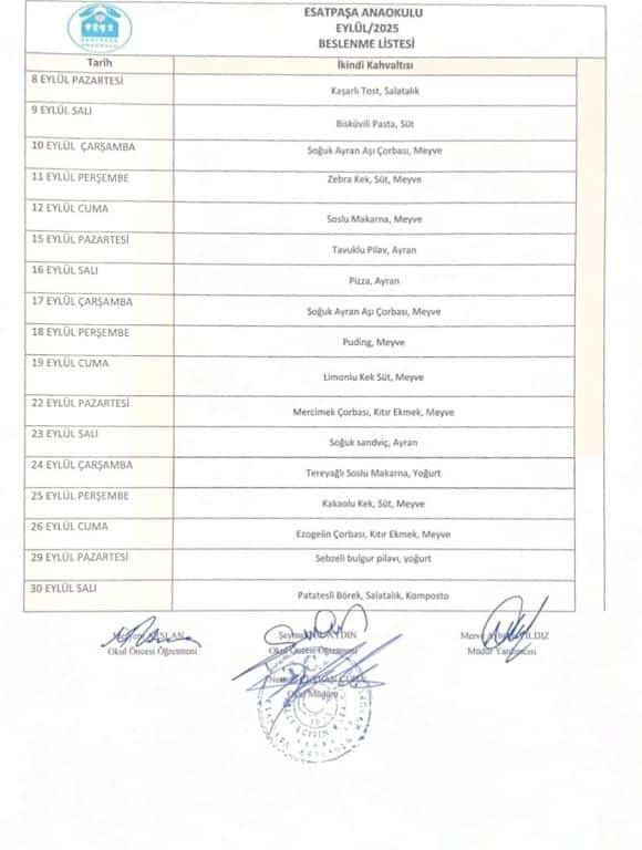 2025-2026 EĞİTİM-ÖĞRETİM YILI EYLÜL AYI BESLENME LİSTESİ